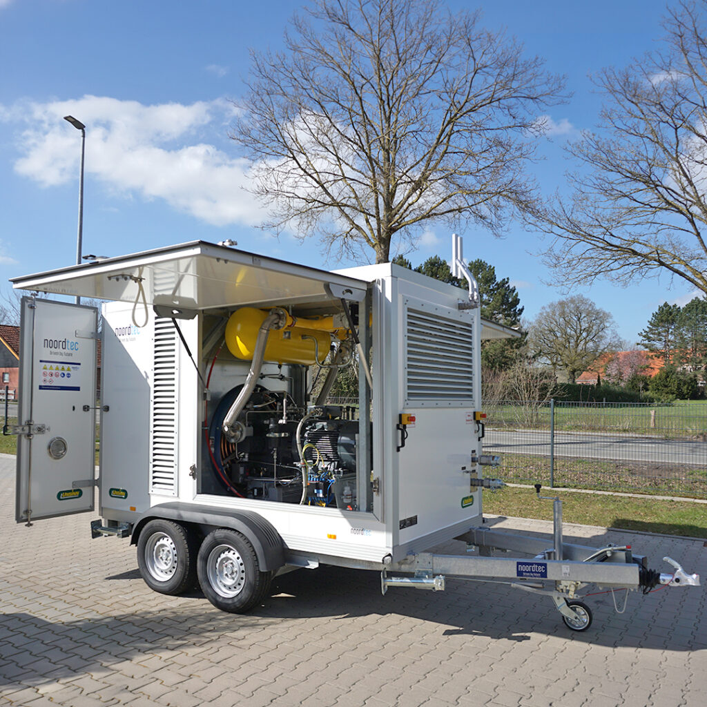Die mobile Rekompressionseinheit ist unsere neue Lösung zur Evakuierung von Gasnetzen und somit Vermeidung von klimaschädlichen Methanemissionen– kompakt auf einem Trailer, flexibel einsetzbar und technisch auf dem neuesten Stand. Ideal für Erdgas, Wasserstoff, Biogas und mehr. Das System arbeitet mit einem gasdichten Kolbenkompressor in einem wartungsfreundlichen All-in-One-Gehäuse. Je nach Bedarf kann unsere mobile Einheit mit Wärmerückgewinnung zur Gasvorwärmung, einem Generatoranschluss, Schalldämpfer oder Durchflussmessung ausgestattet werden.